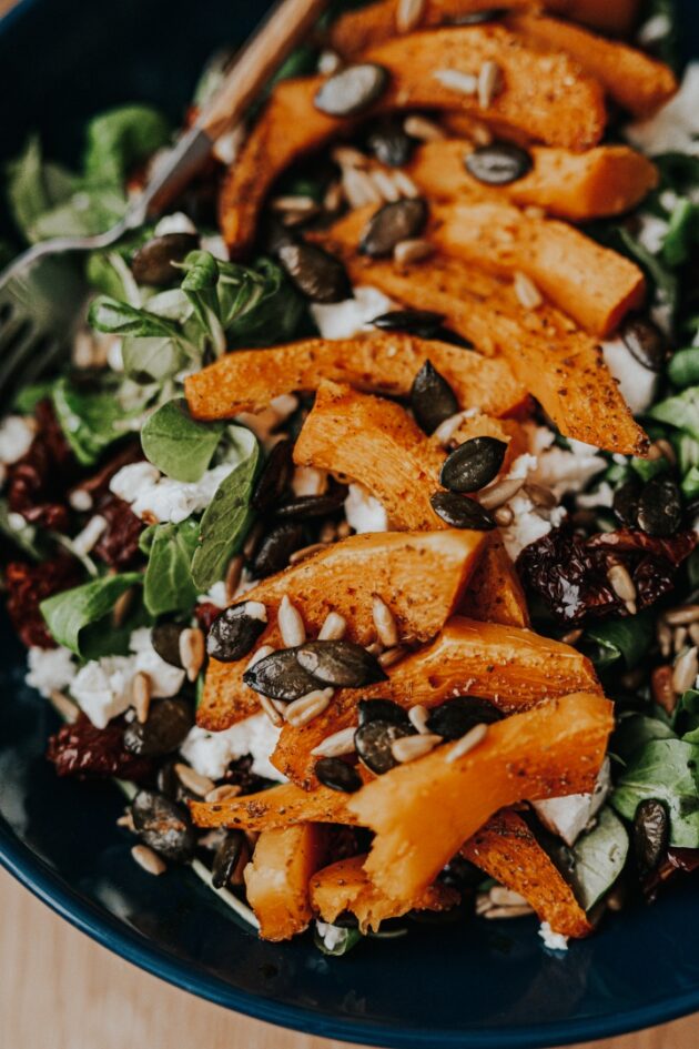 Šalát s pečenou tekvicou posypaný slnečnicovými semienkami – RECEPT