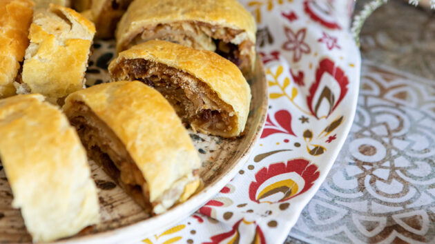 POSTUP: Musíme všetky suroviny (na cesto) spolu zamiešať. Dáme vypracovať cesto, ktoré je potrebné vyvaľkať (do obdĺžnika) na doske (pomúčenej). Ďalej je potrebné očistiť jablká a nastrúhame ich na hrubo a zamiešame ich so škoricou a sladidlom. Následne dáme podusiť na ohni (jemnom). Rozmiešaný prášok (pudingový) pridáme v minime vody a dáme ešte trošku povariť. Ďalej pridáme a zamiešame hrozienka. Plnku (jablkovú) natrieme na cesto a jemne ho musíme zarolovať. Na plech vystlaný papierom (na pečenie) preložíme zrolované cesto. Vrch natrieme olejom a napicháme špáradlom. Na záver dáme piecť na približne 30 minút pri teplote 180 °C. Servírovať môžeme spolu s umytým ovocím.