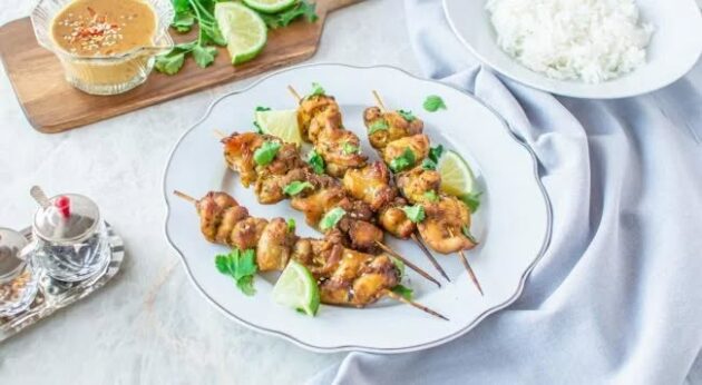 POSTUP: Na začiatok rozmixujeme v mixéri suroviny na omáčku satay na hladkú zmes (hustá forma). Časť omáčky je potrebné odložiť si na servírovanie. Následne musíme nakrájať kuracie prsia na hrubé, dlhšie rezance. Potom ich obaliť v omáčke a navliecť na drevené špajle. Ďalší krok je rozloženie špízov na pekáč a pokvapkáme/postriekame malým množstvom oleja. Dáme piecť do rúry/airfryera cca 12 minút z každej strany. V airfryeri to budeme o trošku rýchlejšie, ale to závisí od konkrétneho výrobku a iných okolností. Pár minút pred dopečením musíme potrieť špízy malým množstvom medu. Ďalej uvaríme ryžu. Na záver už iba pridáme omáčku satay a môžeme servírovať.